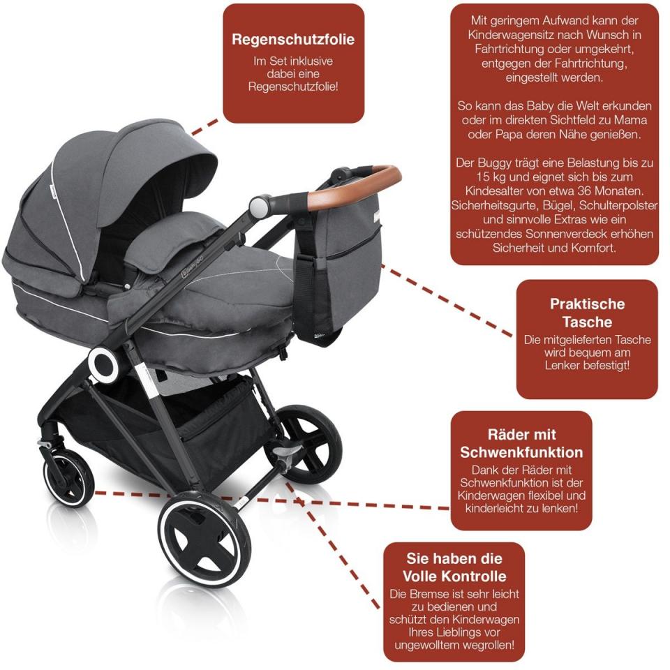 BabyGo Halime Kombi Kinderwagen / Buggy Gestellfarbe schwarzDer Halime Pram Buggy von babyGo ist ein angesagter 3in1 Kombikinderwagen mit praktischen Vorzügen und hohen Sicherheitsstandards.Als multifunktionaler Buggy ist der Kinderwagen von babyGo mit der Babywanne für Neugeborene, dem Sportsitz, wie auch mit einer Autoschale kombinierbar. Der Buggy trägt eine Belastung bis zu 15 kg und eignet sich bis zum Kindesalter von etwa 36 Monaten. Sicherheitsgurte, Bügel, Schulterpolster und sinnvolle Extras wie ein schützendes Sonnenverdeck erhöhen Sicherheit und Komfort. Einkäufe, Wickeltaschen und weitere Gegenstände finden im Aufbewahrungskorb einen geeigneten Platz.Schnell und unkompliziert lässt sich der Buggy von babyGo zusammenklappen und ist deshalb besonders leicht und platzsparend zu verstauen. Mit geringem Aufwand kann der Kinderwagensitz nach Wunsch in Fahrtrichtung oder umgekehrt, entgegen der Fahrtrichtung, eingestellt werden. So kann das Baby die Welt erkunden oder im direkten Sichtfeld zu Mama oder Papa deren Nähe genießen. Dank der Räder mit Schwenkfunktion ist der Kinderwagen flexibel und kinderleicht zu lenken.Besonderheiten:• von Geburt an geeignet• verstellbarer Sitz• modernes Design• flexible Schwenkräder