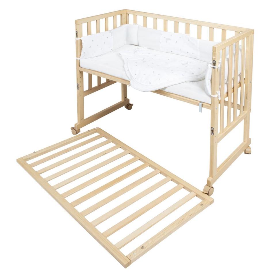 Roba Kids Stubenbett 3in1 Beistell- & Babybett, Bank natur lackiert SternenzauberDas Stubenbett safe asleep 3in1 bietet ein ideales Schlafklima und ist Beistellbett zum Elternbett, Babybett und Kinderbank in einem. Das naturfarbene Bettchen kommt inklusive atmungsaktiver Matratze mit Jaquard Bezug, gepolstertem safe asleep Nestchen Air und safe asleep Schlafsack Easy Air Gr. 56/62 im Design Sternenzauber. Das Stubenbett safe asleep 3in1 lässt sich mit den mitgelieferten Haken leicht und sicher am Elternbett einhängen und durch die Höhenverstellung auf die Höhe der Elternmatratze einstellen. Vier mitgelieferte Bremsrollen machen es zum mobilen Stubenwagen oder Babybett. Das 3in1 Stubenbett ist von Geburt an geeignet und wächst mit bis zur Kinderbank für größere Kinder. Die Marke safe asleep von roba wurde speziell entwickelt, um die Voraussetzungen für eine optimale Schlafumgebung zu schaffen und dadurch den sicheren Schlaf von Säuglingen zu begünstigen. Der leichte und äußerst komfortable safe asleep Schlafsack mit Mesh und die punktelastische und luftzirkulierende safe asleep Matratze sind mit dem AIR-balance System ausgestattet, das wie eine natürliche Klimaanlage wirkt. Innovative Belüftungszonen des safe asleep Schlafsacks sorgen für einen Temperaturausgleich und ein gesundes Wohlfühlklima. Das atmungsaktive Mesh-Material des safe asleep Nestchens verhindert die CO2 Rückatmung und ermöglicht eine optimale Luftzufuhr, wodurch die Gefahr einer Überhitzung minimiert wird. Der safe asleep Matratzenkern ist nach Öko-Tex Standard 100 schadstoffgeprüft. Der abnehmbare Bezug der safe asleep Matratze ist bei 60 C waschbar. Das Stubenbett sowie die komplette Ausstattung ist nach den aktuellsten Sicherheitsstandards nach Norm EN 1130-1+2:1996 entwickelt und produziert. Liegefläche des Stubenbetts safe asleep 3in1: 90 x 45 cm, Gesamtmaß des Stubenbetts safe asleep 3in1: Höhe 85,5 cm, Breite 90 cm, Tiefe: 49,5 cm.