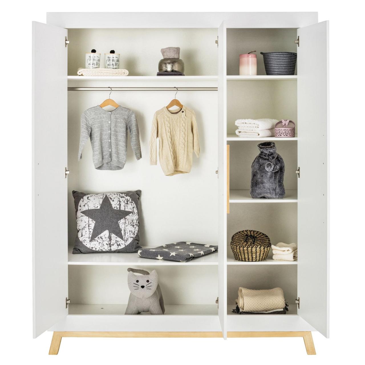 Schardt Kleiderschrank Miami White Schrank 3-türig weiß geöltMiami White – ein Kinderzimmer zum TräumenDie geradlinige Kindermöbelserie Miami White passt sich mit seinen seidenmatten weißen Möbelfronten jedem Zuhause optimal an. Einen harmonischen Kontrast bilden dabei die formschönen Massivholzelemente in Buche. Ein Kinderzimmer mit klarer Formsprache. Die geräumige Einteilung von Wickelkommode und Schrank sorgt für optimalen Stauraum im Alltag. Das Kinderbettchen kann im Handumdrehen zum Juniorbett umgebaut werden. Schrank mit 3 Türen Soft-Close-System 2 lange Böden, 4 kurze Böden 1 Kleiderstange H: 194 cm B: 154 cm T: 53 cm
