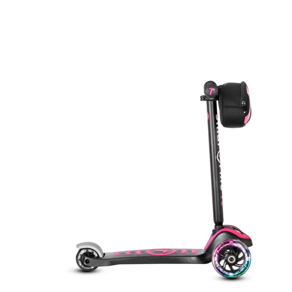 smarTrike T5 mit Leuchträder & Tasche Outdoor Scooter für Kinder pink Düst funkelnd vorbei: Der Scooter T5 von Smartrike ist mit LEDs in den Rädern ausgestattet, die einen großen Auftritt garantieren und den Fahrspaß noch vergrößern. Die Lenkertasche erlaubt es, einen Snack oder den Lieblings-Dino mitzunehmen. Natürlich glänzt der Roller auch mit praktischen Funktionen: Sein rutschhemmendes Deck und seine Federstahl-Bremse sorgen für Sicherheit. Die Lenkstange und das Deck sind an die Größe des Kindes anpassbar. Der Scooter ist für Kinder ab drei Jahren geeignet. Das Erste, was hier auffällt, ist das coole Design des Scooters: sportive Farben und eine schlanke Silhouette überzeugen sofort. Wenn dann noch beim Rollern die LEDs in den Rädern blitzen, staunen Groß und Klein. Der Scooter hat aber noch weit mehr zu bieten: TPR überzieht Griffe und das Deck. Die rutschhemmende Beschichtung sorgt für ein Extra an Sicherheit. Die Federstahl-Bremse sorgt für einen raschen Stopp. Die Räder Sie sind kugelgelagert und bieten besten Fahrkomfort. Sie sind zudem pannensicher und vorne extra größer gehalten, was das Cruisen über jedes Terrain erleichtert. Hinten sorgt das Doppelhinterrad für ein Plus an Komfort. Die Lenkstange ist zweifach in der Höhe verstellbar. Das Deck lässt sich in der Länge an die Größe des Kindes anpassen. So wächst der Roller mit dem Kind mit und bietet länger großen Fahrspaß. Der T5 verfügt über eine verstellbare Härteeinstellung der Kippfähigkeit. Dein Mini trainiert so Schritt für Schritt, seine Balance zu halten. Die erste Stufe deaktiviert die Kippfähigkeit vollständig. Dein Kind lernt, seine Fähigkeiten richtig einzuschätzen und die Balance zu halten. In der zweiten Stufe ist die Kippfähigkeit dann aktiviert: Dein Kind verbessert im Spiel seine Balance-Fähigkeit weiter. Als cooles Extra ist hier eine große Lenkertasche dabei: In ihr kann Dein Mini seine Lieblingsspielzeuge unterbringen, denn die möchten auch gern mitfahren. Auch Snacks, ein Fläschchen und anderes lassen sich hier transportieren. Der Scooter animiert Kids dazu, draußen zu spielen. Er unterstützt die Entwicklung motorischer Fähigkeiten und trainiert den Gleichgewichtssinn. Das Spielzeug trainiert auch die Konzentrationsfähigkeit. Der Roller lässt sich nach dem Gebrauch oder für den Transport platzsparend falten. Es ist bis zu 25 Kilogramm belastbar und wiegt knapp drei Kilogramm. Der Scooter ist für Kinder ab drei Jahren geeignet. ab 3 Jahren bis 25 kg belastbar verstellbares Deck mit rutschhemmender TPR-Beschichtung, zweifach höhenverstellbare Lenkstange (68-79 cm), rutschhemmende, TPR beschichtete Handgriffe, extra große Vorderräder mit PU-Mantel, integriertem LED-Licht und Speichen, Doppel-Hinterrad, kugelgelagerte Räder, Hinterradbremse aus Federstahl, verstellbare Härteeinstellung der Kippfähigkeit, Lenkertasche 60(L) x 27(B) 63(H) cm, Ø Vorderrad ca. 12 cm, Ø Hinterrad: ca. 7 cm